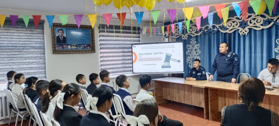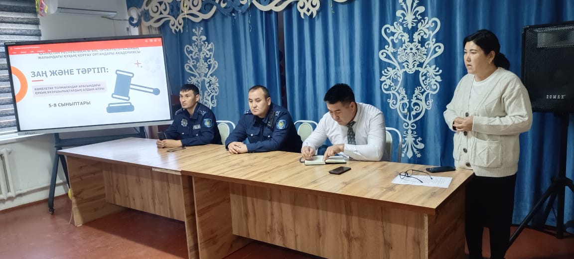 Жиын барысында кәмелетке толмаған жасөспірімдердің өмір қауіпсіздігі, құқықтық жауапкершілік, құқық бұзушылықтың алдын алу бағытында түсіндірме жұмыстары жүргізілді. «Заң және тәртіп» тақырыбындағы арнайы дайындалған слайд арқылы оқушыларға құқық бұзушылық дегеніміз не, түнгі уақытта жүру ережелері, буллинг (жәбірлеу), вандализм сияқты маңызды тақырыптар бойынша жан-жақты ақпарат берді.